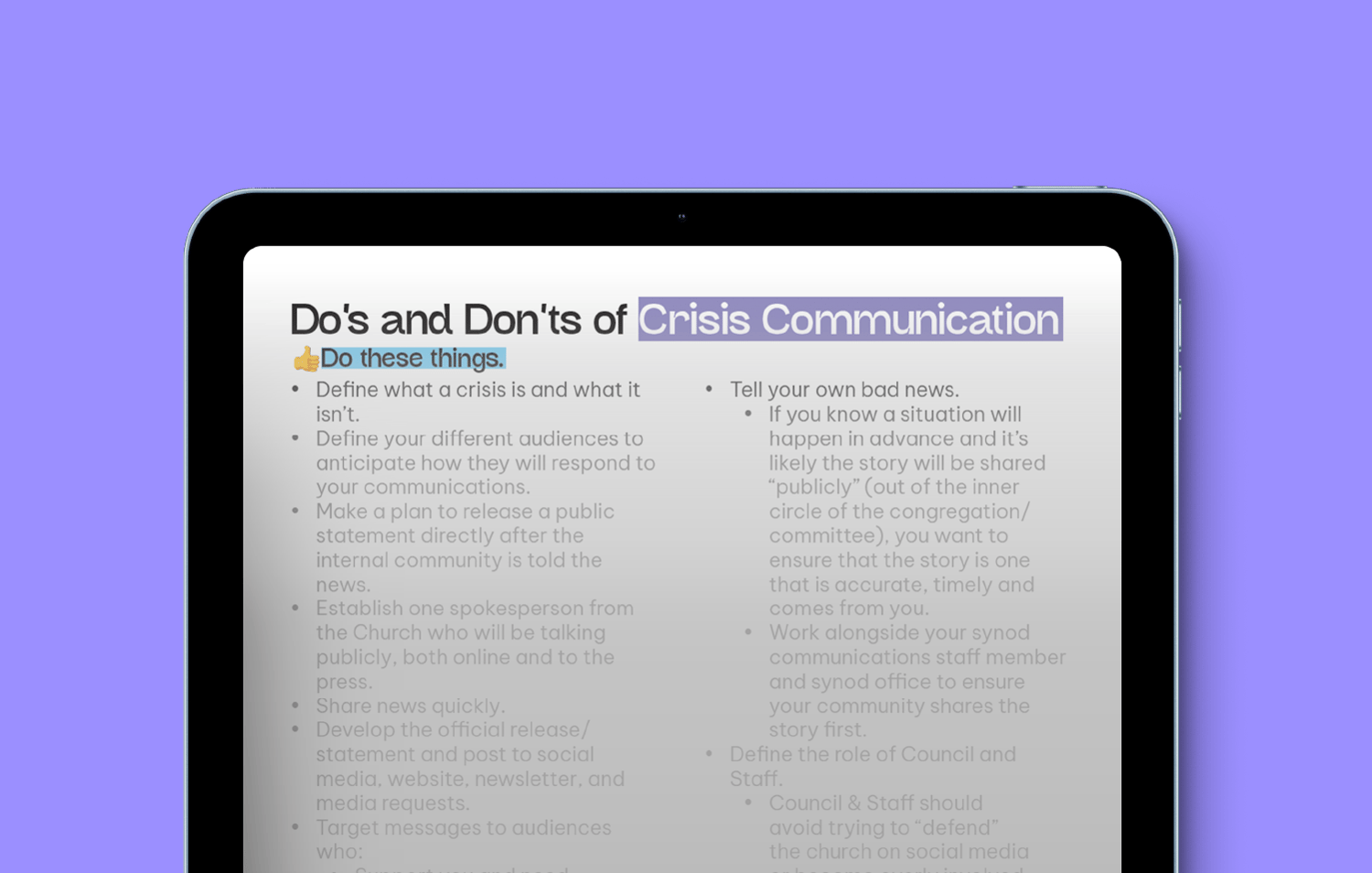 It covers what actually counts as a crisis (not every disagreement needs a press release), how to get ahead of the narrative before it spreads, and how to work with your synod office and leadership team to make sure your message is clear and consistent. It also includes a few things to definitely not do—like posting too fast or trying to manage it all alone.
